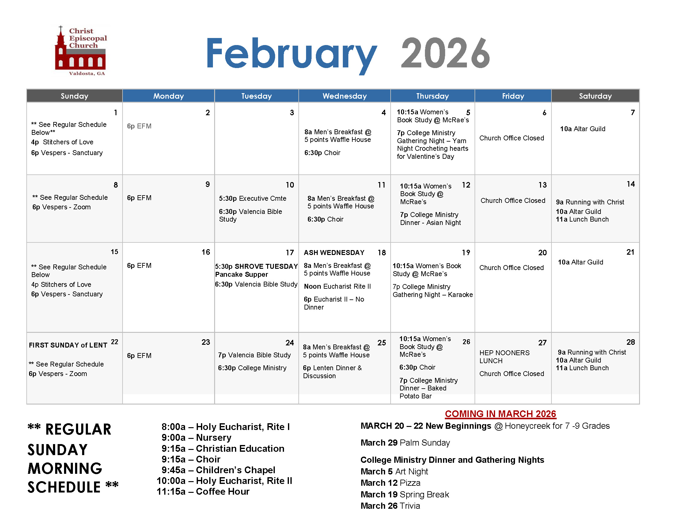 For our current official calendar of church events, click an image below to enlarge it. For other ongoing calendar information, check a recent issue of our weekly newsletter, The Grapevine or a recent service bulletin.